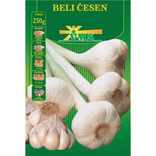 9.99€Beli česen – Glavica je bela, vsebuje okoli 10 strokov. Sadimo jeseni ali spomladi, pobiramo poleti. Zelo dobro se skladišči.