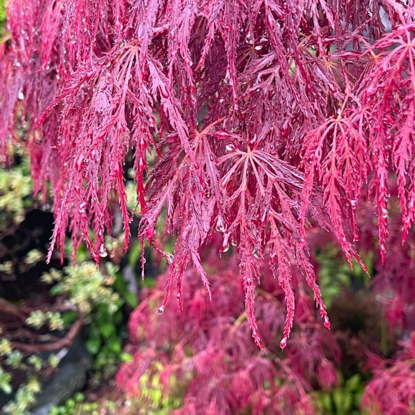 V spomladanskem času se pojavijo nežni, globoko narezani listi, ki se skozi sezono obarvajo v bogate rdeče in kostanjeve odtenke. Listi so ozki, nežni in močno deljeni, kar daje rastlini zračen, prefinjen videz. Veje so rahlo upognjene, zato krošnja deluje mehko in naravno razgibano.