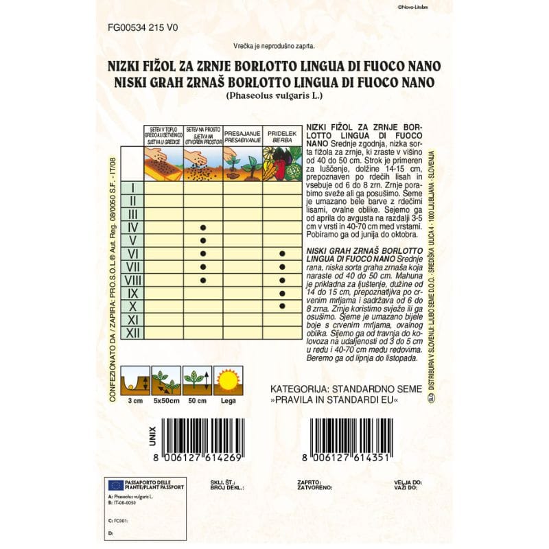 FIŽOL NIZKI ZA ZRNJE BORLOTTO LINGUA DI FUOCO NANO srednje zgodnja, nizka sorta fižola za zrnje, ki zraste v višino od 40 do 50 cm. Strok je primeren za luščenje, dolžine 14-15 cm, prepoznaven po rdečih lisah in vsebuje od 6 do 8 zrn. Zrnje porabimo sveže ali ga posušimo. Seme je umazano bele barve z rdečimi lisami, ovalne oblike. Sejemo ga od aprila do junija na razdalji 3-5 cm v vrsti in 40-70 cm med vrstami. Pobiramo ga od julija do septembra. Pakiranje: 100g.