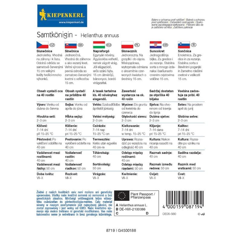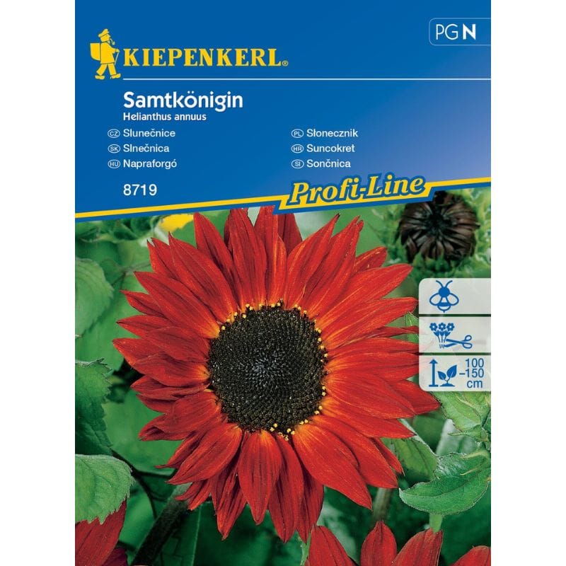 Seme rdeča Sončnica, Kiepenkerl –  ‘Samtkönigin’ očara s svojimi žametno rdečimi cvetovi, ki vrtu prinašajo brezčasno lepoto in dosežejo višino 150–200 cm. Idealna za rezano cvetje, v vsak aranžma vnese eleganco. Ta enoletnica hitro postane osrednja točka gredic in zagotavlja impozanten videz.