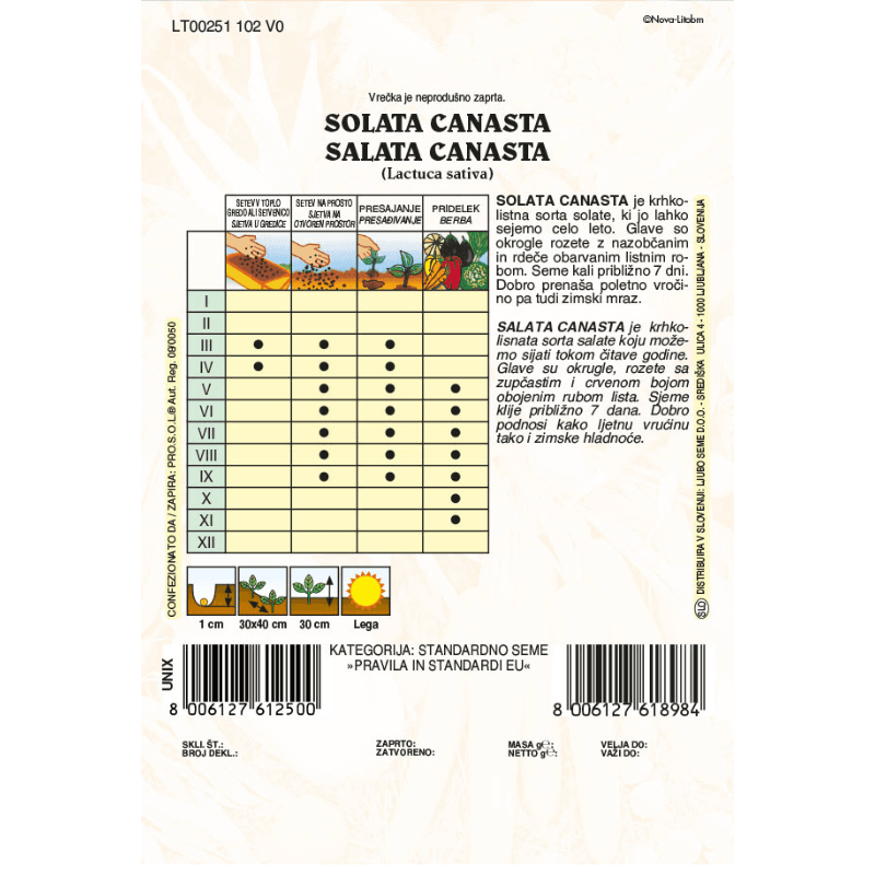 SOLATA CANASTA je krhkolistna sorta solate, ki jo lahko sejemo celo leto. Glave so okrogle rozete z nazobčanim in rdeče obarvanim listnim robom. Seme kali približno 7 dni. Dobro prenaša poletno vročino pa tudi zimski mraz.